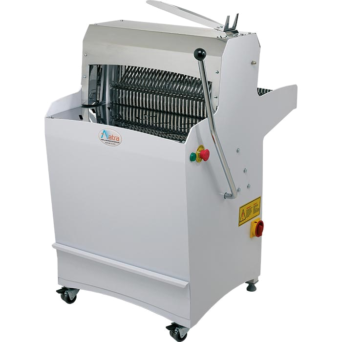 The Atra manual bread slicing machine is designed for efficient, precise slicing without flattening or tearing the bread. By placing the bread next to the knives and pulling the lever, you can achieve clean, evenly cut slices. The machine can handle up to 450 slices per hour and accommodates bread up to 500 mm in length and 50-180 mm in height, with slice thickness adjustable between 10-20 mm. Suitable for bakeries, patisseries, hotels, and large kitchens, it features hygienic stainless steel surfaces, with optional teflon-coated blades for extended sharpness. The manual lever action ensures quiet operation with minimal vibration, and the machine is easily movable thanks to its wheels. Additionally, it includes a special attachment for quick manual packing and supports 220 and 380 V power.