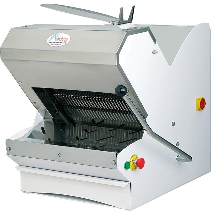 The Atra table-top bread slicing machine is designed for efficient and precise cutting without flattening or tearing the bread. Capable of slicing up to 450 slices per hour, it accommodates bread up to 400 mm in length and 50-150 mm in height, with adjustable slice thickness between 10-20 mm. To operate, simply place the bread next to the knives and pull the lever. Ideal for bakeries, patisseries, hotels, and large kitchens, it features hygienic stainless steel surfaces with optional teflon-coated blades for extended sharpness. The manual lever action ensures quiet operation with minimal vibration, and the machine is easily movable with attached wheels. Additionally, it includes an attachment for quick manual packing of the bread and requires only 0.6 m² of working space, supporting both 220 and 380 V power.