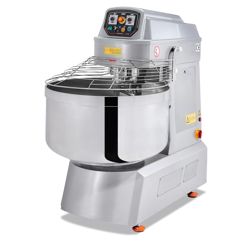 The spiral dough mixer Atra with a fixed bowl provides fast dough mixing, reducing flour consumption and saving you time and energy. Simply set the kneading time and the machine will run quieter than previous models until the kneading programme is complete. The control panel includes a thermometer, speed control, timer and emergency stop button, and has an auto shut-off system. The two-position motor provides different speeds for optimum dough kneading and all surfaces of the machine are made of food-safe materials such as hygienic stainless steel. The machine is easy to move around thanks to its wheels, and thanks to the new belt pulley system it runs quieter, having a fitted rubber belt for smoother operation.