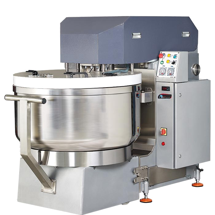 The Atra spiral mixer with a mobile bowl allows you to mix dough quickly and efficiently, using less flour for a homogenate mixture. It saves time and energy, operating more quietly than previous models, with an indicator built into the spiral hook to control the temperature. The mobile bowl, combined with a lifting-tilting machine, streamlines the process by easily pouring the dough into the hopper of the dough divider. The new digital control panel includes a thermometer, bowl and spiral hook controls, speed control, timer, and a mixing head up/down button. The double-positioned motor provides two speeds, each with adjustable times, ensuring precise dough mixing. All surfaces, including the bowl, spiral hook, and scraping knife, are made of hygienic stainless steel, and the new belt pulley system reduces noise with a rubber belt instead of a metal chain.